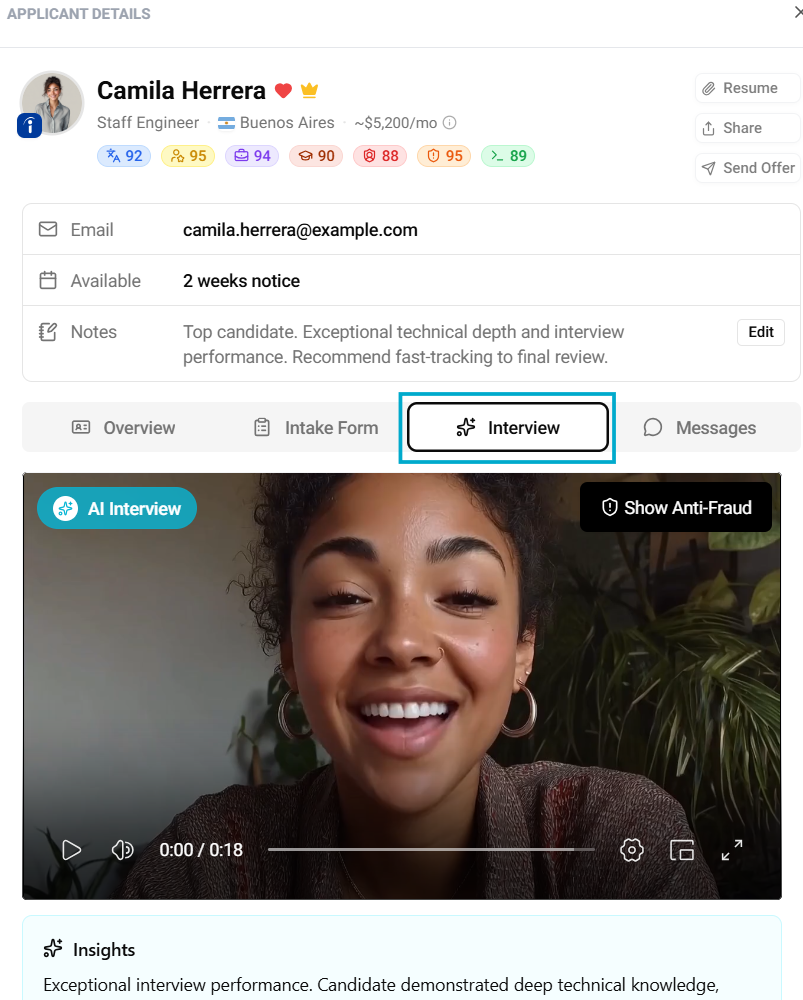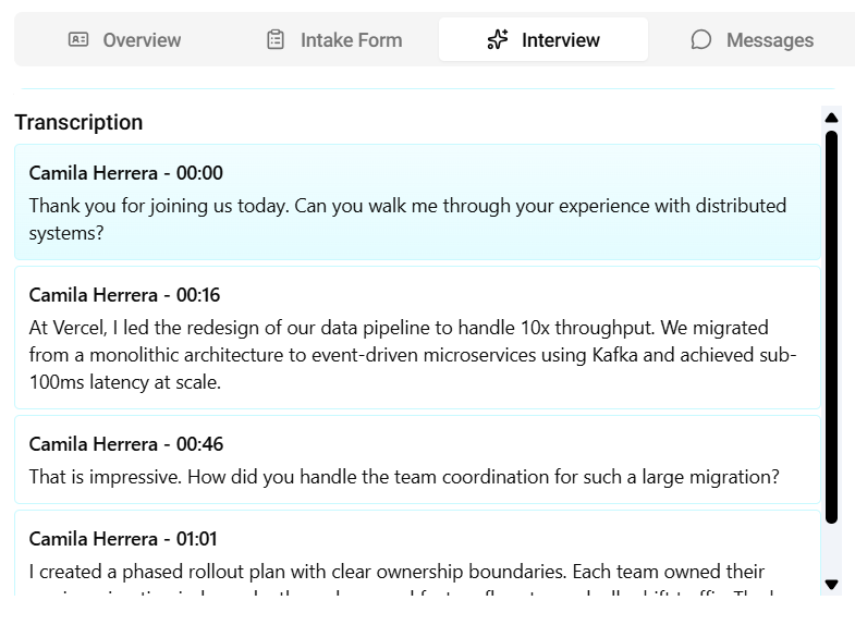 You can review transcripts of candidate responses from AI interviews to better understand their answers and evaluation.