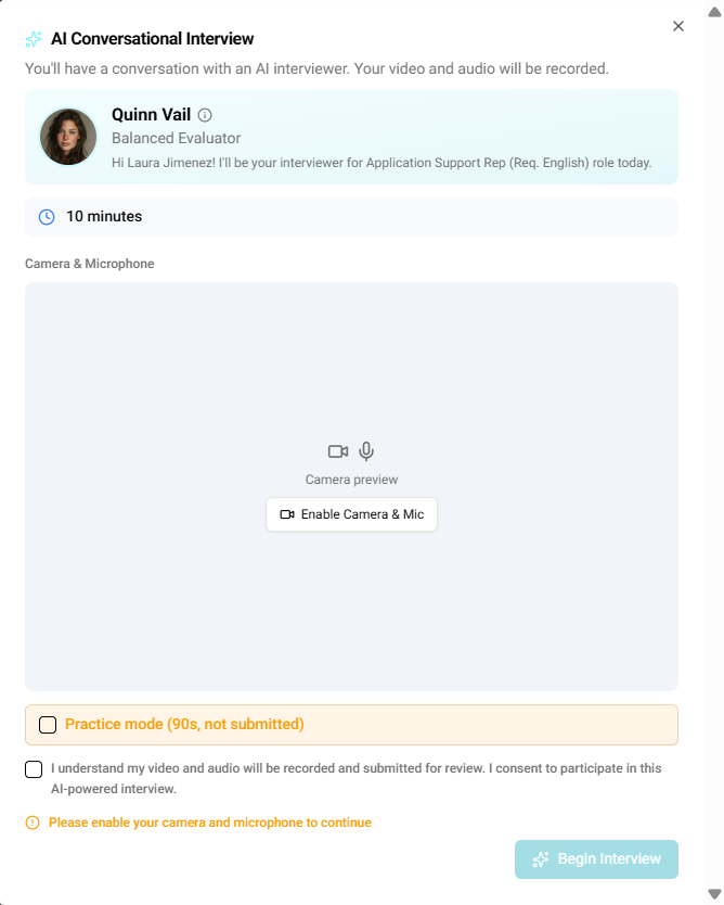 During the AI interview process, candidates go through a guided experience designed to evaluate their skills and fit for the role.