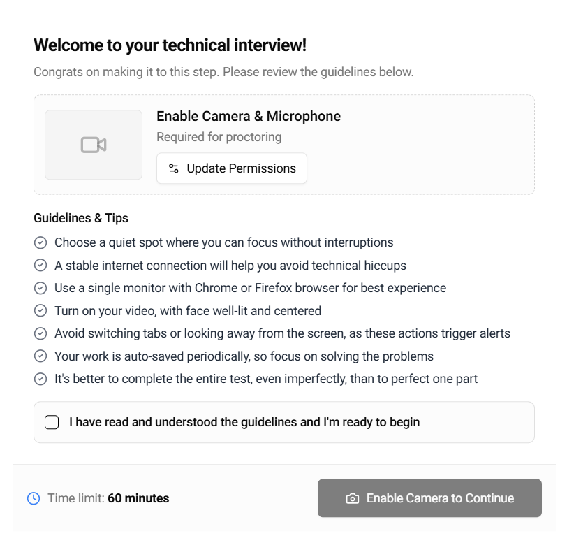 To ensure a fair process, the interview includes built-in monitoring features such as video recording during the interview, and eye-tracking, and behavior monitoring.