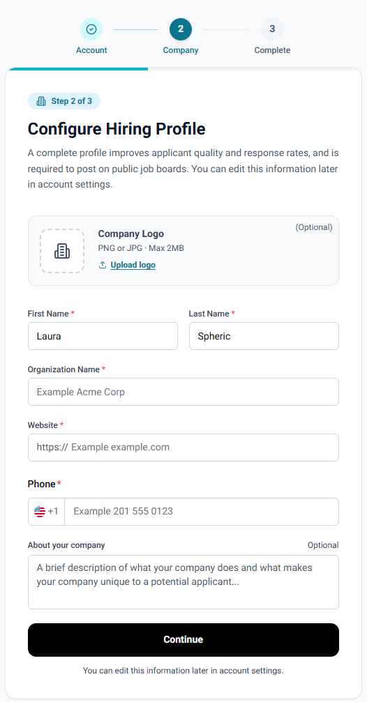 Follow the on-screen steps to finish setting up your account. This includes basic information about your company and a brief description of your hiring needs.