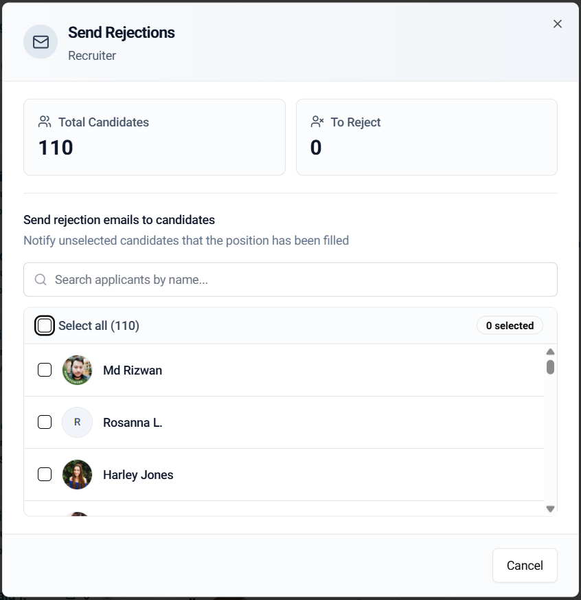 Select the candidates you want to send rejection messages to.