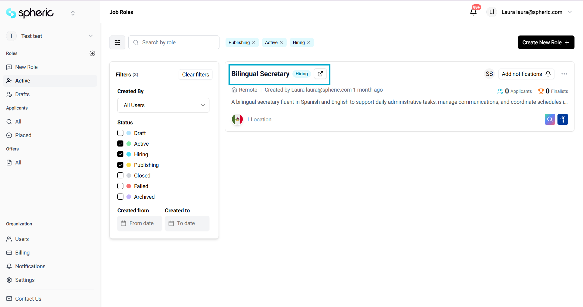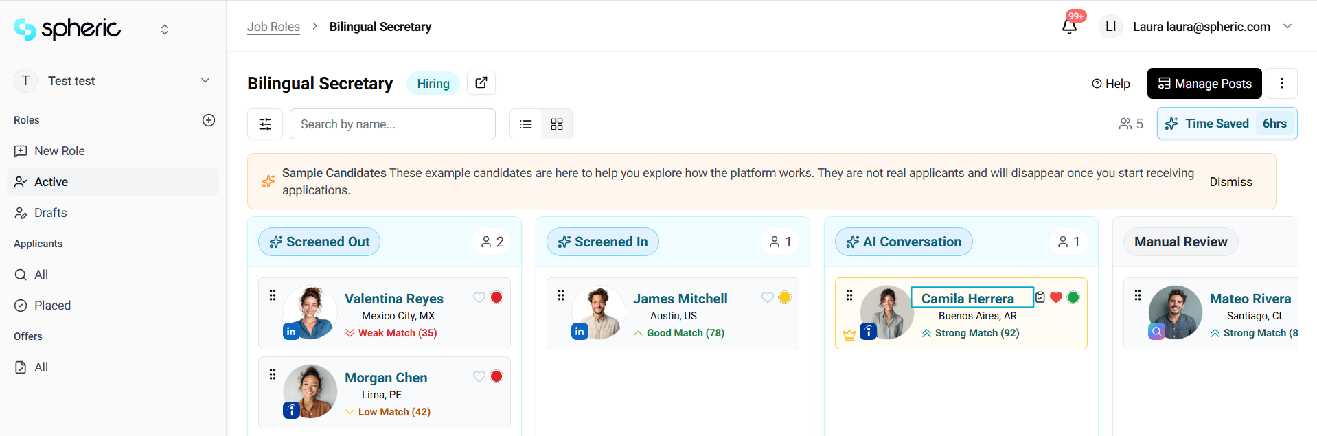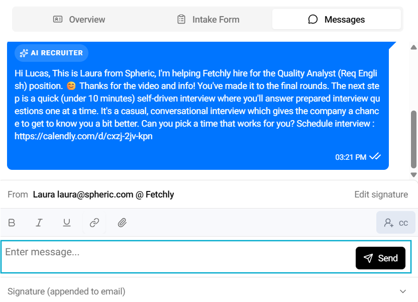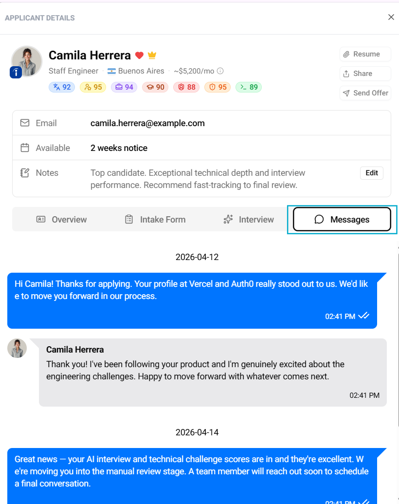 You can communicate directly with candidates from within Spheric using the Messages tab in the applicant card.