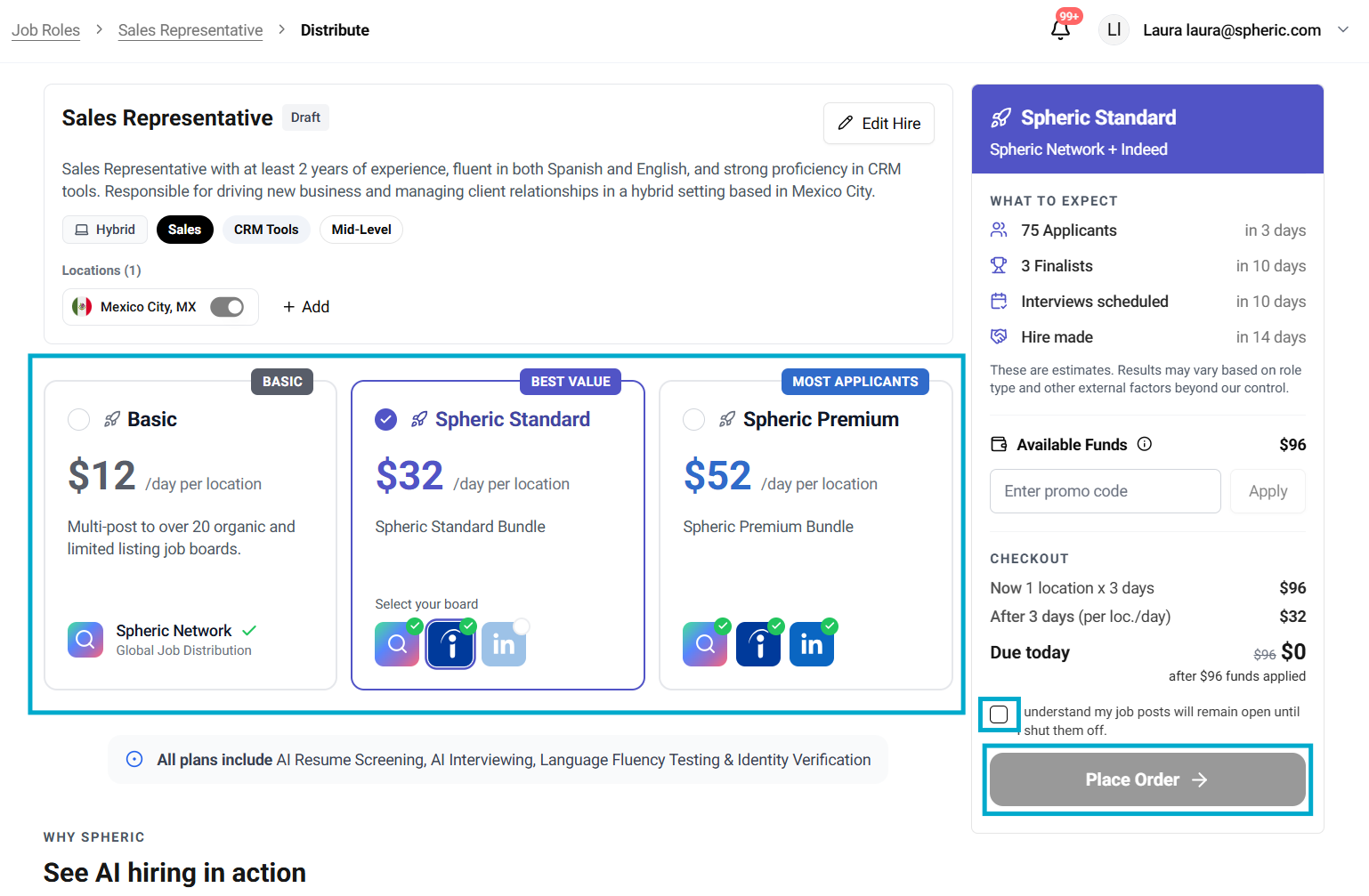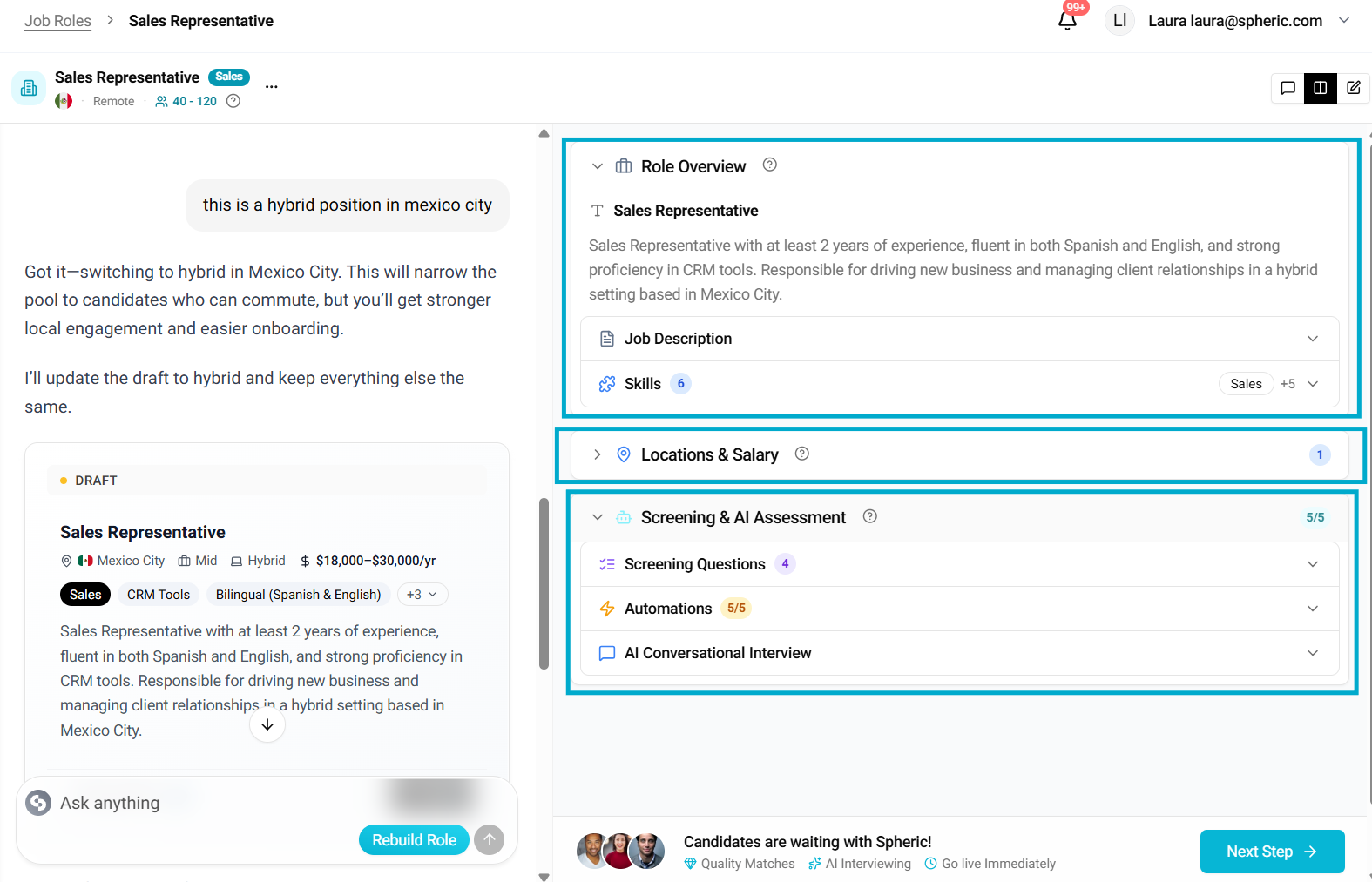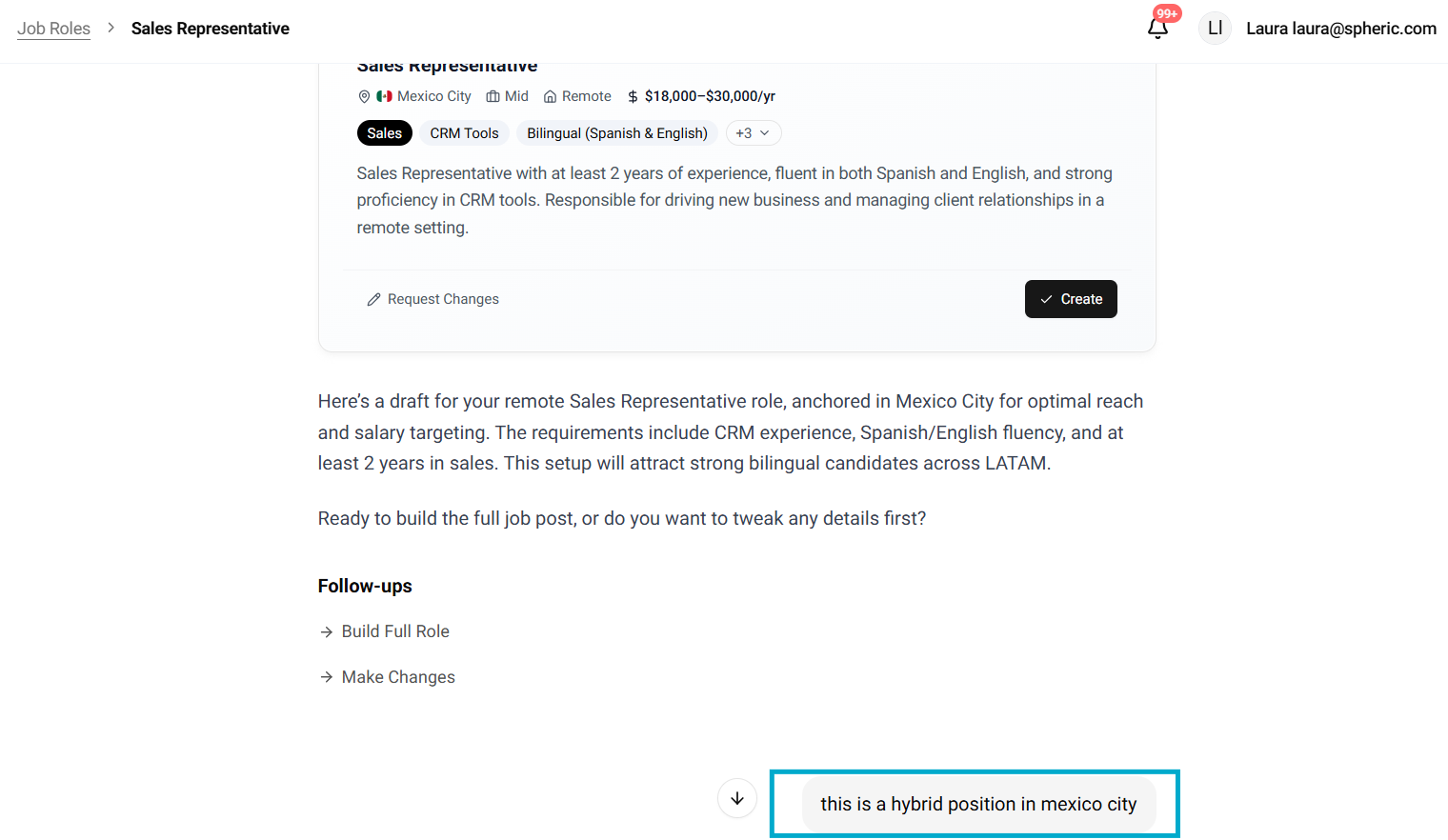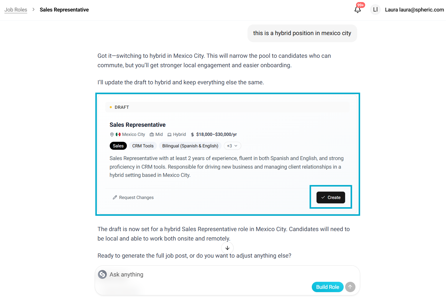 Before creating a job, it helps to have a general idea of the role (e.g. Sales Representative, Developer), key skills or requirements, any preferences like location, language, or experience level. Don’t worry if it’s not fully defined—Spheric AI will help you shape it.